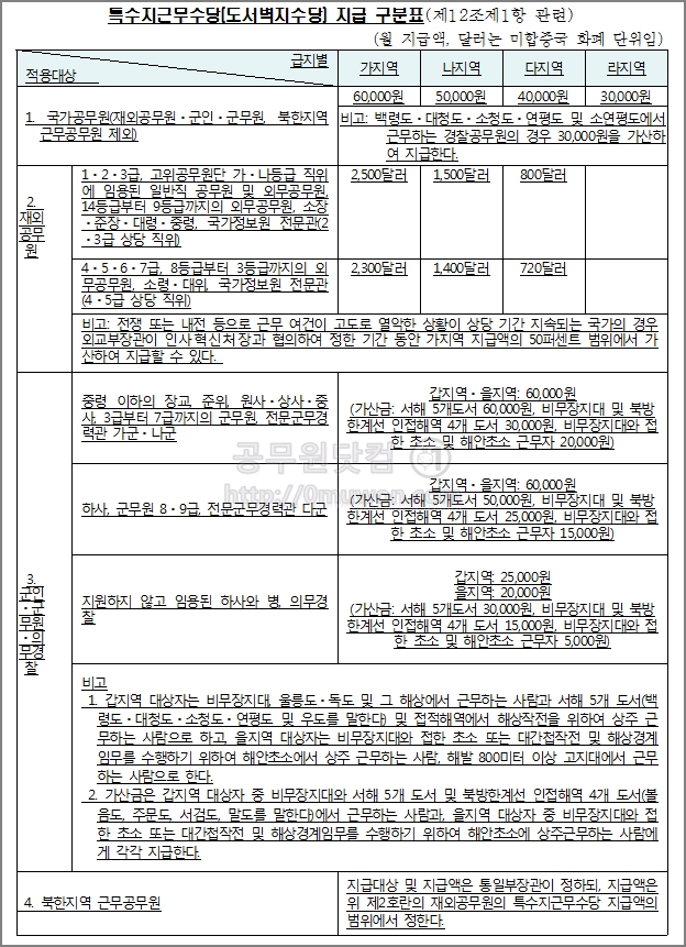 국가공무원의 경우 가지역은 6만원, 나지역은 5만원, 다지역은 4만원, 라지역은 3만원입니다. 백령도, 대청도, 소청도, 연평도 및 소연평도에서 근무하는 경찰공무원의 경우에는 3만원을 가산합니다.