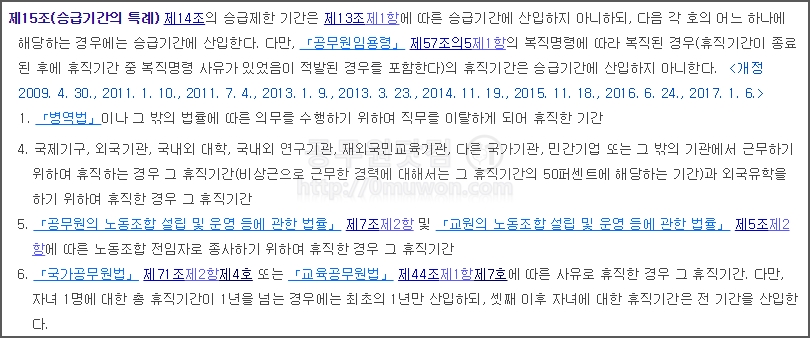 퇴직수당 지급을 위하여 재직기간을 계산할 때는 또 다릅니다. 공무상 질병휴직, 병역휴직, 고용휴직, 전임노조휴직, 육아휴직, 법정의무수행휴직을 제외한 휴직기간은 2분의 1을 뺍니다.
