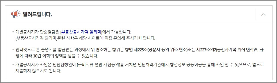 2. 주의사항을 읽어보세요. 인터넷으로 개별공시지가 확인서를 발급 받는 과정에서 위조, 변조하는 행위는 10년 이하의 징역을 받을 수 있습다. 개별공시지가 단순 열람은 부동산 공시가격 알리미에서 가능합니다. <▼부동산공시가격 알리미>