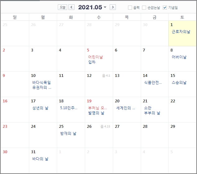 5월에는 공휴일이 2번 있습니다. 바로 5월 5일 어린이날, 그리고 5월 19일 부처님 오신 날입니다. 그 밖에도 기념일 등이 많은데 공휴일은 아닙니다. 그리고 아쉽게도 근로자는 쉴 수 있는 5월 1일 근로자의 날이 토요일과 겹칩니다. 공휴일이 모두 수요일이라 연계해서 사용하기도 애매하네요.