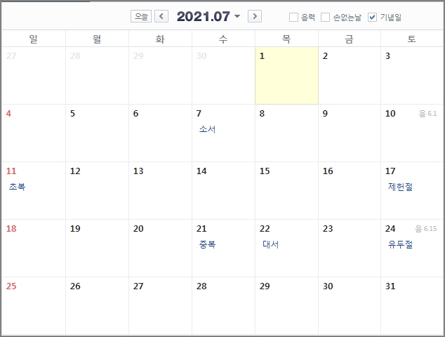 7월에는 공휴일이 없습니다. 7월 17일 제헌절이 있기는 합니다만 공휴일이 아닙니다. 제헌절이 공휴일이 아닌 이유 확인해보시기 바랍니다. ▼ 국경일인 제헌절이 공휴일이 아닌 이유, 제헌절 태극기 게양방법은?