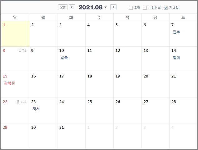 8월 15일 광복절이 있습니다. 광복절도 일요일과 겹칩니다. 7월과 같은 상황입니다. 태극기 다는 것 잊지마시고요.