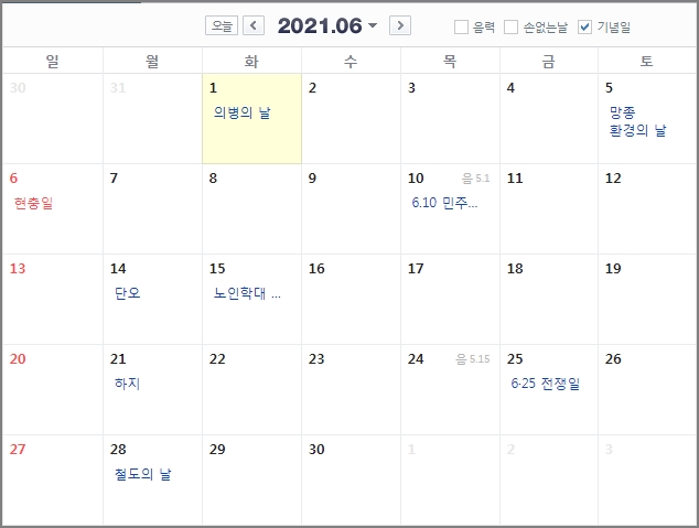 6월에는 6일 현충일이 있습니다. 이번 현충일은 일요일과 겹칩니다. 6월 7일이 대체휴일 등으로 지정되지 않는다면 주말을 제외하고는 휴일은 없다고 보면 됩니다. 현충일에도 태극기 달아야한다는 것을 기억하세요.