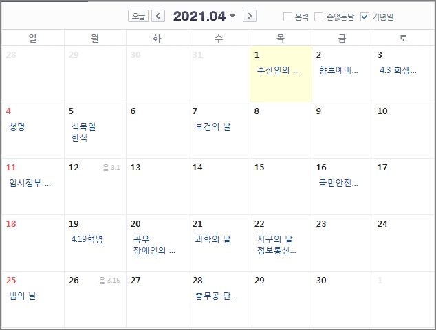4월에는 보시다시피 공휴일이 없습니다. 아쉽네요. 4월 11일 임시정부 수립의 날이 있는데 공휴일이 되면 좋겠다는 생각을 해봅니다.