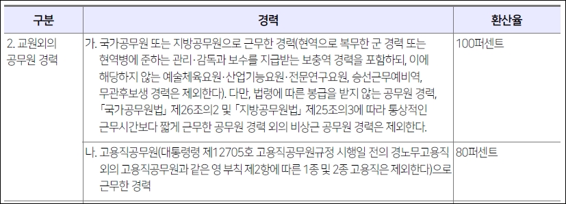 교육공무원은 교원경력, 교원외의 공무원 경력, 유사경력 등으로 구분하여 경력환산율을 적용합니다. 교원경력은 100%이내, 교원외의 공무원 경력은 80~100% 이내, 유사경력은 30%~100% 이내로 인정이 됩니다.
