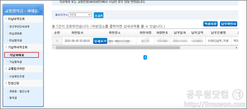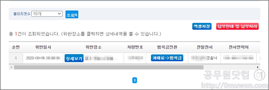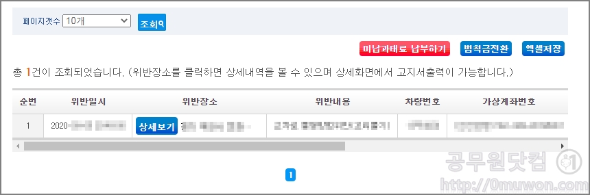 위반내역이 리스트로 나옵니다. 위반장소를 클릭하면 상세내역으로도 볼 수가 있습니다. 운전자 본인이 위반한게 아니라면 범칙금을 전환할 수도 있습니다. 이파인에서 본인이 처리한 범칙금 전환은 과태료로 다시 되돌릴 수 없으므로 신중을 가해야 합니다.