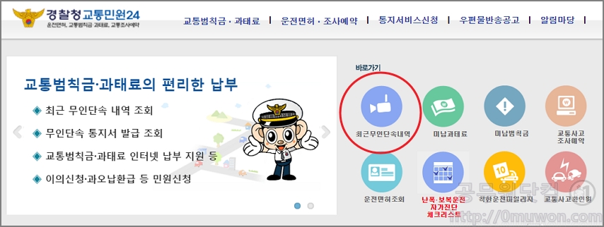 먼저 무인단속 내역등을 조회하는 법입니다. 이파인 홈페이지에 접속 후에 바로가기 메뉴에서 최근무인단속내역을 클릭합니다. 최근무인단속내역은 과속 · 신호위반 등의 무인단속 장비 또는 캠코더 장비로 단속된 자료이며 사전통지, 1차 기간내의 미납과태료 입니다.