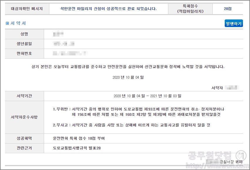 마지막으로, 착한마일리시 신청을 하시면 됩니다. 2020년 9월 25일부터는 범칙금나 과태료 미납금이 있으면 서약이 불가합니다. 착한마일리지 신청 후 성공을 하면 운전면허 특헤점수 10점이 부여가 됩니다. 미납금을 납부한 분들은 바로 신청까지 완료하시기 바랍니다. - 착한운전 마일리지 인터넷 신청으로 운전면허 벌점 차감 받기