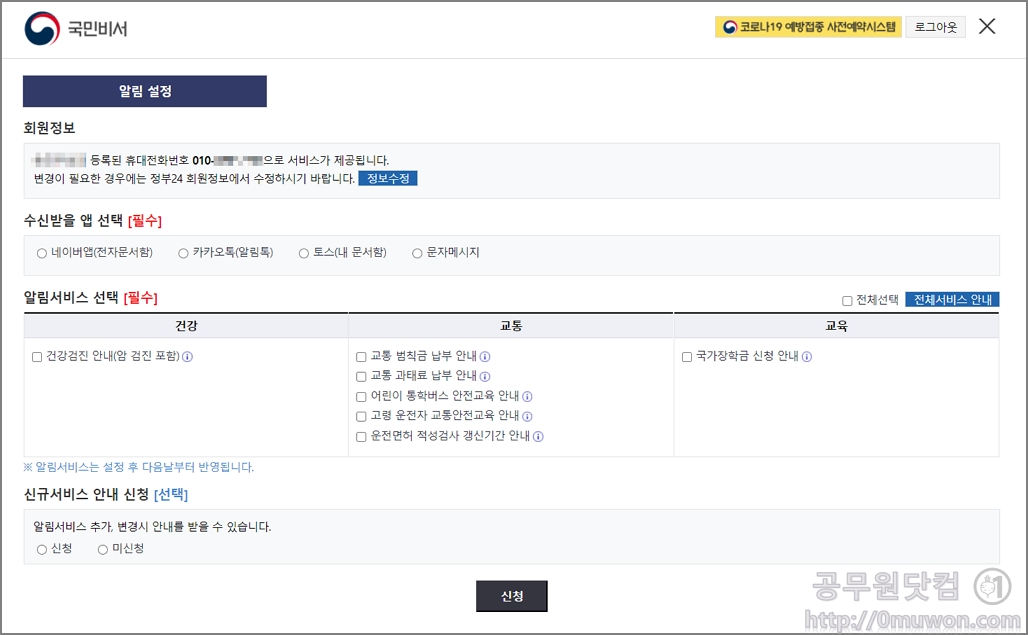 5. 알람설정을 합니다. 등록된 휴대전화 번호로 서비스가 제공이 됩니다. 수신받을 앱을 선택할 수가 있습니다. 네이버앱, 카카오톡, 토스, 문자메시지 중 1개를 선택하면 됩니다. 그리고 알림을 받고 싶은 서비스를 선택합니다.