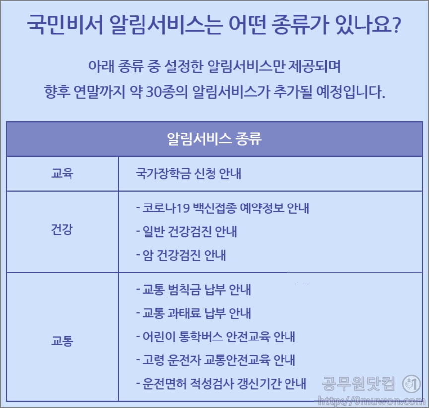 지금 제공되고 있는 서비스 목록입니다. 국가장학금 신청안내, 코로나19 백신접종 예약정보 안내, 일반 건강검진 안내, 암 건강검 안내, 교통 범칙금 납부 안내, 교통 과태료 납부 안내, 어린이 통학버스 안전교육 안내, 고령 운전자 교통안전교육 안내, 운전면허 적성검사 갱신기간 안내 등입니다.