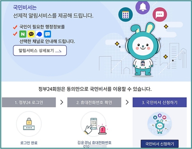 그래서, 국민이 필요한 행정정보를 비서처럼 안내를 해주는 국민비서 알림서비스를 제공하고 있습니다. 서비스를 신청하면 나에게 필요한 정보를 늦지 않게 알려 주어 놓치지 않고 이용을 할 수 있습니다.