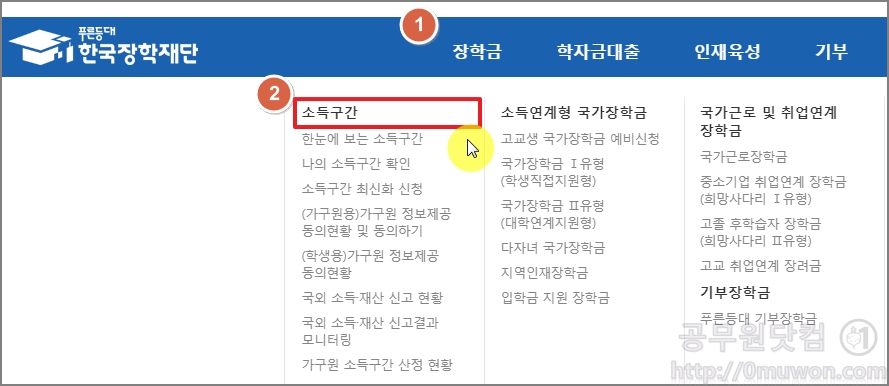 재단 홈페이지에 접속을 합니다. 상단 메뉴에서 "장학금 > 소득구간"을 클릭합니다. <홈페이지 바로가기>
