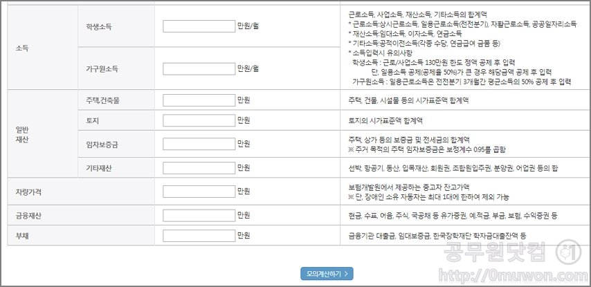 가구원소득에는 50%를 공제 후 입력합니다. 부모 등 가구원의 소득이 400만원인 경우 200만원을 입력하면 됩니다. 그리고 일반재산(주택, 건축물, 토지, 임차보증금, 기타재산)을 입력합니다.