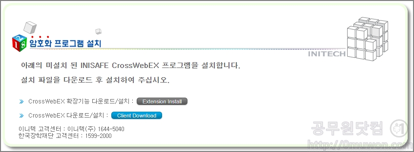 ▼ 암호화 프로그램을 설치합니다. 기존에 설치가 되어 있는 경우에는 자동으로 다음 페이지로 진행이 됩니다. CossWebEX 확장기능 다운로드하여 설치를 합니다.