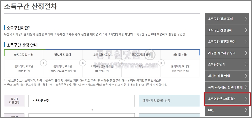 ▼ 소득구간 산정절차 페이지가 나옵니다. 여기에서 우측메뉴를 보면 "소득인정액 모의계산" 메뉴를 선택합니다.
