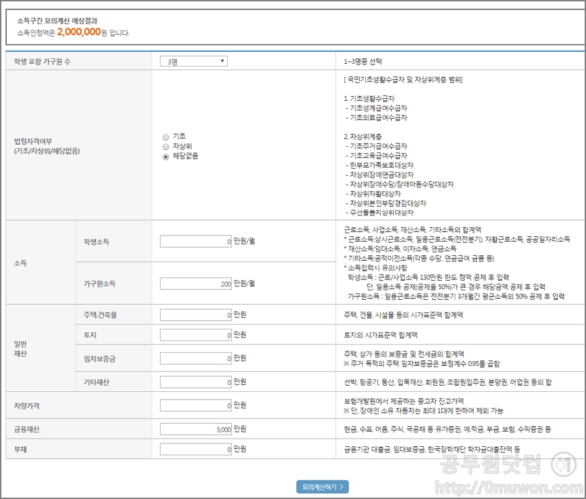 소득구간 모의계산 예상결과입니다. 질문에 가구원 수가 3명, 학생소득 0원, 가구원소득 400만원, 재산 5000만원인 경우 소득인정액과 소득분위였습니다. 소득인정액은 200만원이 됩니다. 계산방법을 읽어보신분은 알겠지만, 재산의 경우 5400만원이 기본공제가 됩니다. 소득인정액 200만원은 소득분위 3구간에 해당이 됩니다.