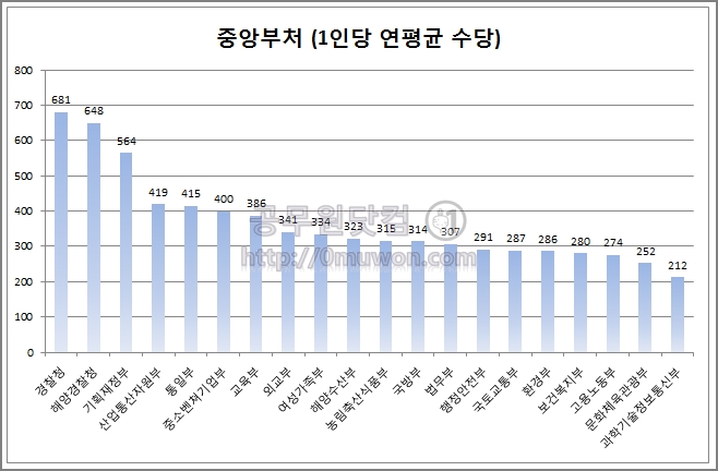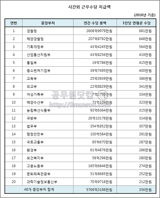 고용노동부, 문화체육관광부, 과학기술정보통신부 등은 적은 편에 속합니다. 과학기술정보통신부의 경우 1인당 연평균 212만원으로 월 18만원 정도의 시간외근무수당을 지급 받았습니다. 중앙부처의 1인당 연평균 수당은 약 356만원 정도입니다.