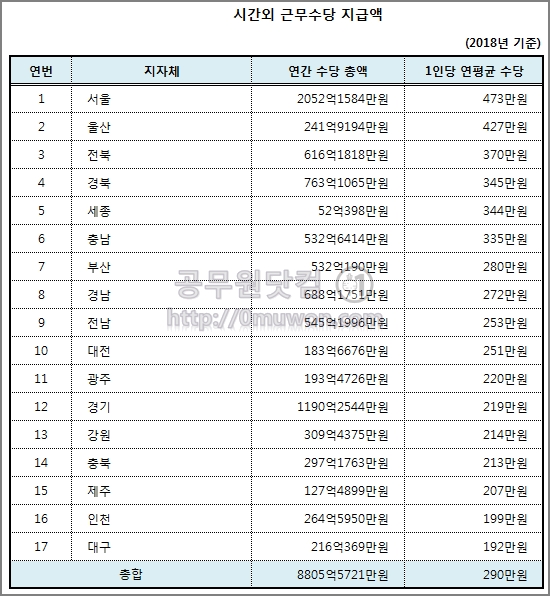경기도, 강원도, 충청북도, 제주, 인천, 대구 등은 다른 곳에 비해 시간외근무수당 지급액이 많지는 않습니다. 지자체의 1인당 연평균 수당은 290만원정도입니다.