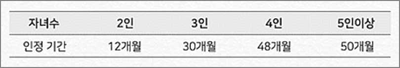 자녀수가 2명이라면 12개월, 3명이면 30개월, 4명이면 48개월, 5명 이상이면 50개월 인정이 됩니다.