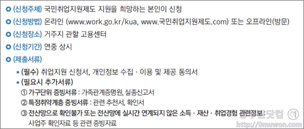 국민취업지원제도는 지원을 희망하는 본인이 신청하여야 합니다. 국민취업제도 홈페이지 또는 거주지 관할 고용센터를 방문해서 신청할 수 있습니다. 취원지원신청서 등을 제출하여야 하며, 필요시 가구단위 증빙서류 등을 제출할 수 있습니다.