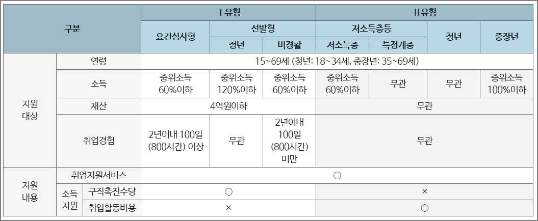 ①요건심사형은 15세~69세 구직자 중 가구 단위 기준 중위소득 60%이하이며, 재산이 4억원 이하이어야 합니다. 그리고 최근 2년간 100일 또는 800시간 이상의 취업 경험이 있어야 합니다.