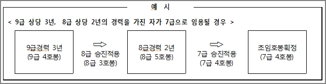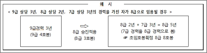 ③임용되는 계급보다 임용되는 계급보다 높은 (상당)계급의 경력의 경우임용되는 계급의 경력으로 보아 경력연수에 1을 더하여 초임호봉을 획정합니다.