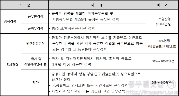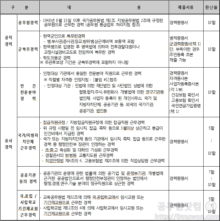 경력은 공무원경력, 군무원경력과 같은 공직경력, 민간전문분야, 국가 및 지방자치단체 임시직 상근 경력 등과 같은 유사경력으로 구분이 됩니다. 공직경력과 동일분야 민간전문분야는 10할 이내 인정이 되며, 그 밖의 유사경력은 50%~100%인정이 됩니다.