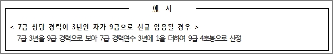 7급 상당 경력이 3년인 자가 9급으로 신규 임용될 경우, 7급 3년을 9급 경력으로 보아 7급 경력연수 3년에 1을 더하여 9급 4호봉으로 산정합니다.