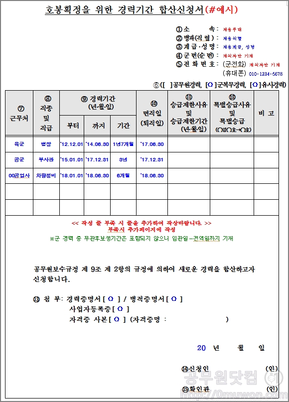 마지막으로 경력기간 합산신청서 작성방법입니다. 호봉획정시 인정되는 공공법인의 범위는 아래 글을 참고하세요.