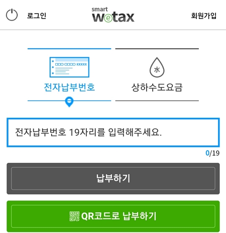 스마트폰으로 납부할 수 있습니다. 스마트폰에 위택스 어플을 설치하고 납부하면 됩니다. 회원가입 없이도 납부가 가능합니다. 고지서에 있는 전자납부번호 19자리를 입력한 후 납부를 하면 됩니다. QR코드로 납부하는 경우 고지서의 QR코드를 이용하면 됩니다.