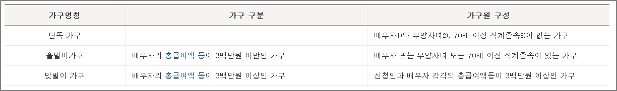 - 홑벌이 가구 : 배우자의 총급여액 등이 300만 원 미만이거나, 부양자녀 또는 70세 이상 직계존속이 있는 가구