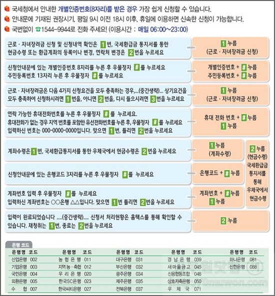 "1544-9944 → 장려금 2번 → 신청 1번 → 개별인증번호 → 주민등록번호 뒷7자리 → 1번 → 계좌번호 및 휴대전화번호 등록 확인 → 신청종료" 순서입니다.