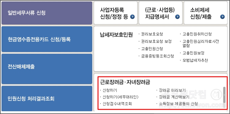 "국세청홈텍스 로그인 → 신청/제출 → 근로·자녀장려금 신청하기 → 간편신청하기 → 신청요건 확인 → 계좌번호/연락처 입력 → 신청하기" 순서로 하시면 됩니다.