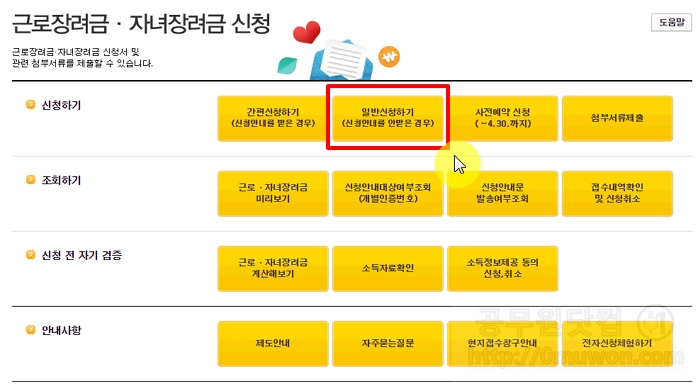 국세청 홈택스 홈페이지 "신청/제출" 선택 후 "근로장려금 자녀장려금 신청하기에서 신청"이 가능합니다. 안내문을 받은 경우와는 다르게 신청요건 등을 먼저 확인하기 위하여 "일반신청하기"로 신청을 해야 합니다. 순서대로 따라해 보시기 바랍니다.