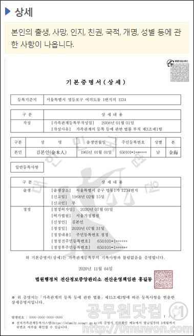기본증명서 상세는 본인의 출생, 사망, 인지, 친권, 국적, 개명, 성별 등에 대한 내용이 있습니다. 기본증명서 일반보다 매우 상세한 정보가 나옵니다.