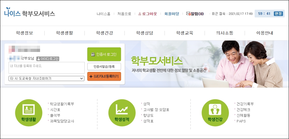 학생 본인이 직접 조회도 가능하며, 학부모가 자녀의 학교 생활 정보도 확인이 가능합니다.