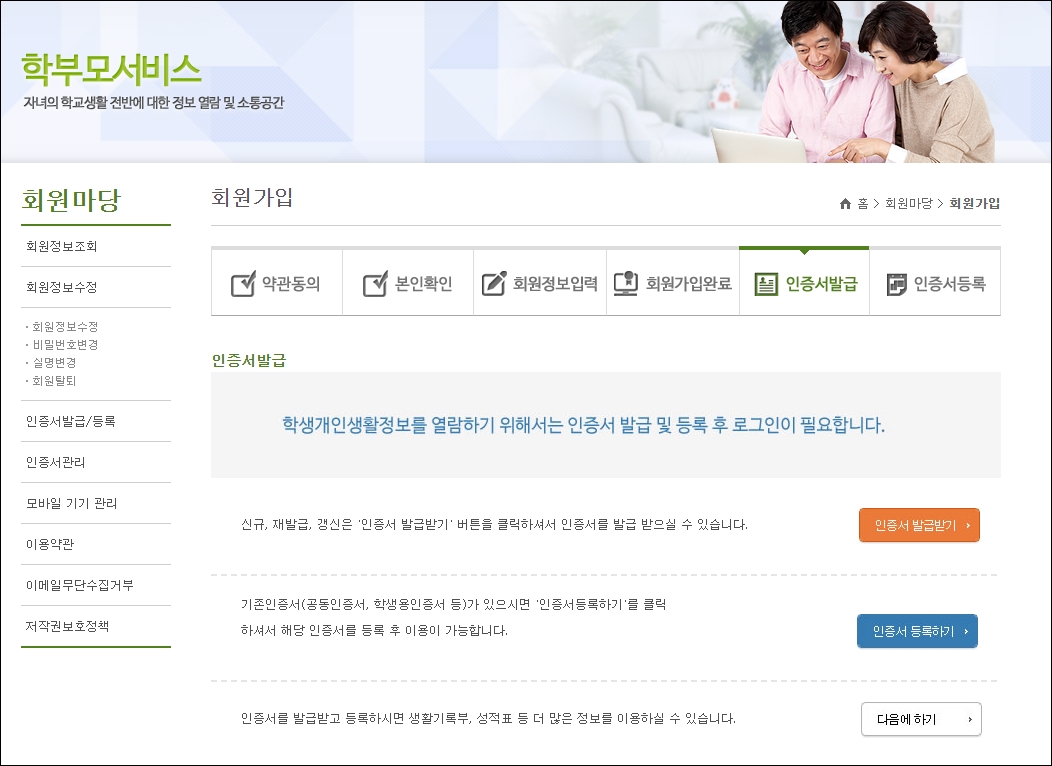 오늘은 나이스 학부모 서비스를 이용하기 위해 회원가입하는 법과 인증서 발급 및 등록하는 법을 알아보았습니다. 자녀를 둔 학부모님들은 인터넷으로 편리하게 자녀의 학교생활 정보를 확인해 보시기 바랍니다.