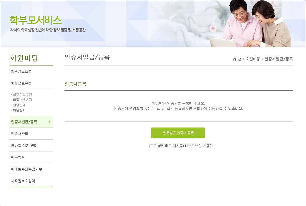 4. 발급된 인증서를 등록을 합니다. 인증서가 변경되지 않는한 최초 1회만 등록하면 됩니다. 등록이 완료되면 나이스 홈페이지 서비스를 정상적으로 이용할 수 있습니다.