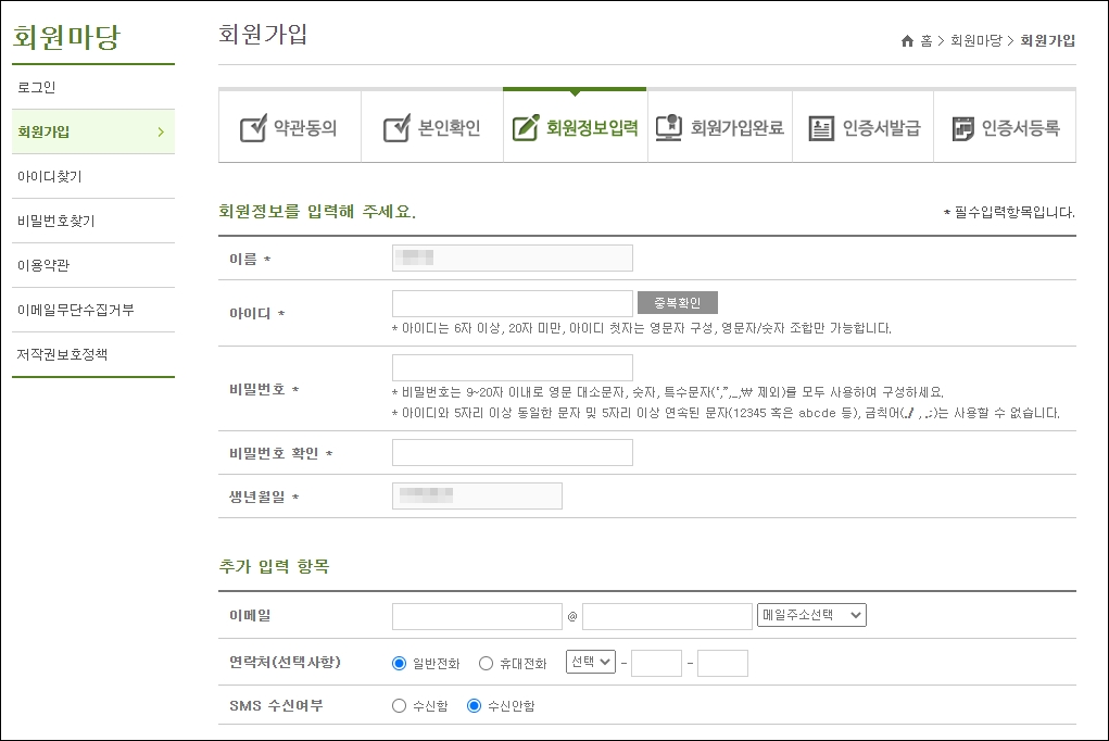 4. 회원정보를 입력합니다. 이름, 아이디 등을 입력합니다. 추가정보는 입력하지 않아도 됩니다.
