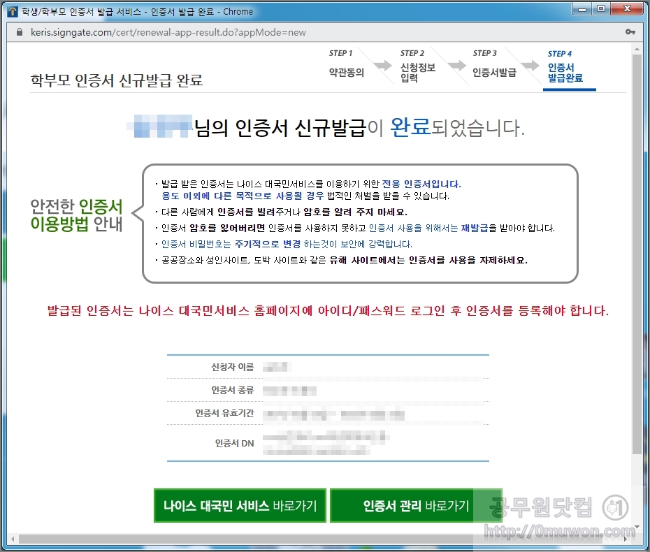 3. 인증서 발급이 완료되었습니다. 발급 받은 인증서는 나이스 대국민 서비스를 이용하기 위한 전용인증서입니다. 인증서 암호를 잃어버리면 인증서를 사용하지 못합니다. 인증서 사용을 위해서는 재발급을 받아야 합니다.