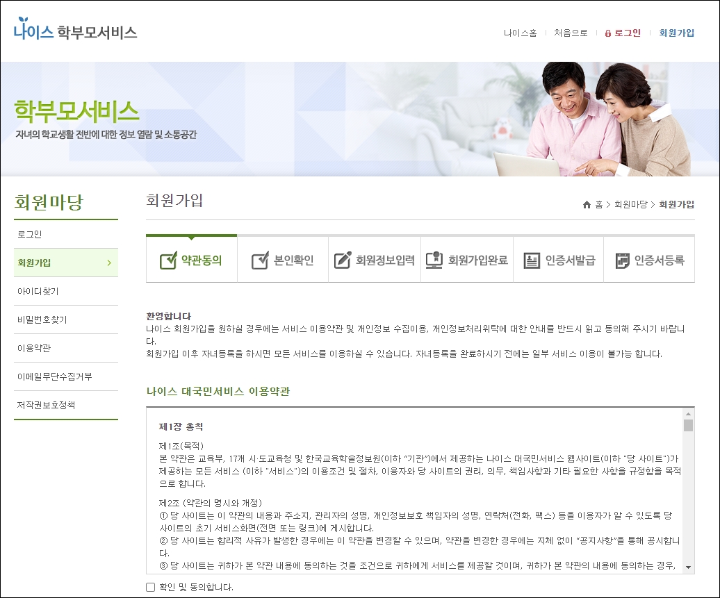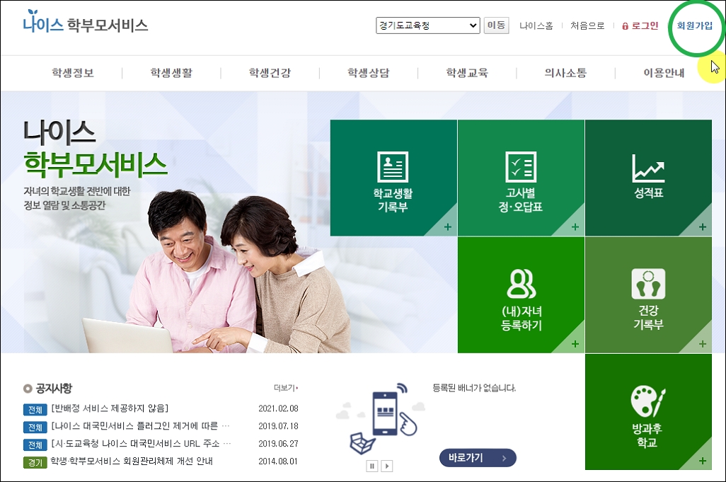 1. 학부모 서비스를 클릭하면 상단에 회원가입 메뉴가 보입니다. 해당 메뉴를 클릭합니다.