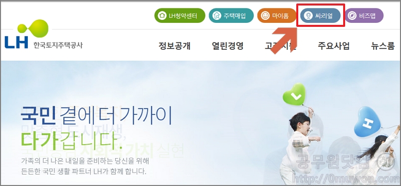 ▼ LH 한국토지주택공사 홈페이지 상단에 '씨:리얼' 메뉴를 클릭합니다. 또는 씨리얼 홈페이지로 바로 접속을 합니다.