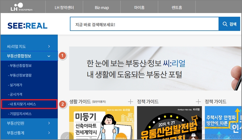 내토지 찾기 서비스는 공인인증서만 있으면 무료로 본인이 소유한 토지와 아파트를 조회할 수 있는 서비스입니다. 한국토지공사에서 서비스를 제공하고 있습니다. LH 한국토지주택공사 홈페이지 또는 SEE:REAL 씨리얼 홈페이지로 접속을 합니다. <씨리얼 홈페이지 바로가기>
