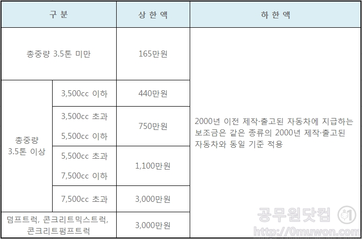 실제 보조금 지급액은 차량조건에 따라 모두 다릅니다. 총중량 3.5톤미만은 상한액이 165만원이빈다. 총중량 3.5톤이상의 경우 3500cc이하는 440만원, 7500cc초과는 최대 3,000만원까지 보조금이 지원됩니다. 도로용 3종 건설기계의 상한액은 3천만원입니다.