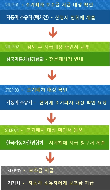조기폐차 보조금 지급대상을 확인합니다. 노후차량 조기폐차 보조금 지급대상 확인 신청서를 작성하여 한국자동차환경협회에 제출을 합니다. 자동차등록증 사본, 특정경유자동차 배출가스 정밀 검사결과 증빙서류, 차량 소유자의 주민등록증이나 운전면허증 또는 운송사업자 등록증 사본을 첨부하여 제출하면 됩니다.