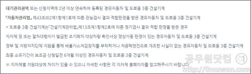 대상차량은 배출가스 5등급 경유자동차 또는 2005년 이전 배출허용기준을 적용하여 제작된 도로용 3종 건설기계입니다. 도로용 건설기계 3종은 덤프트럭, 콘크리트 믹서, 콘크리트 펌프입니다. 단, 지차체별로 신청여부가 다를 수는 있습니다.