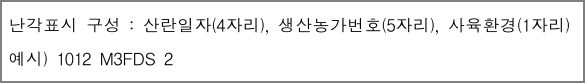 참고로, 달걀 껍데기에 표시되는 10자리 정보는 차례로 나열해 1줄로 표시하거나 산란일자와 그 나머지 정보를 나누어 2줄로도 표시할 수 있습니다.