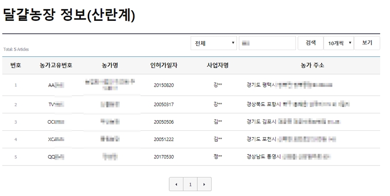 ▼ 농가명, 농장고유번호, 소재지 등으로 검색을 할 수 있습니다. 사업자명, 인허가일자 등도 확인이 가능합니다.
