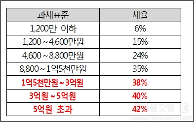 과세표준이 1200만원 이하이면 세율은 6%, 4600만원 이하는 15%, 8800만원 이하는 24%, 1억5000만원 이하는 35%, 3억원 이하는 38%, 5억원 이하는 40%, 5억원을 초과하면 42%입니다.