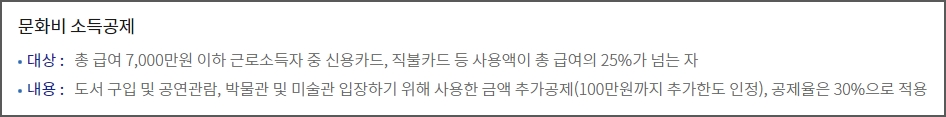 ☞ 총 급여가 7,000만원 이하인 근로소득자만 문화비 소득공제를 적용 받을 수 있습니다.